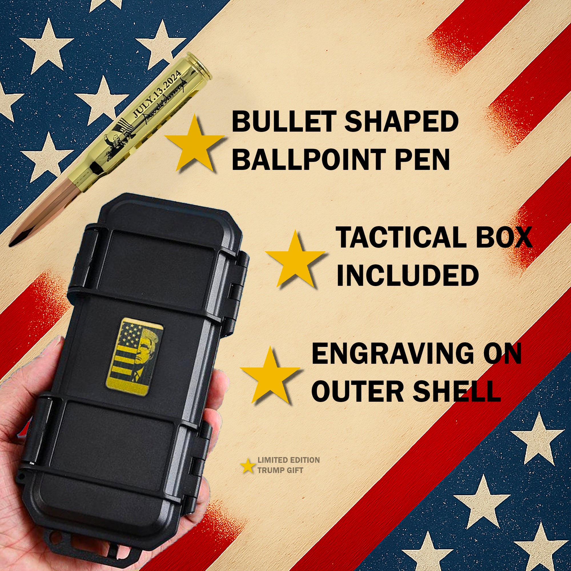 The Donald Trump Pen is a unique gift for patriots, shaped like a brass bullet with a black ink color. This collectible ballpoint pen is both stylish and practical, perfect for those who appreciate a bold statement in their writing instruments. Made from durable brass, this pen is a luxurious addition to any pen collection, showcasing a sense of strength and resilience. Ideal for those who value both functionality and symbolism!